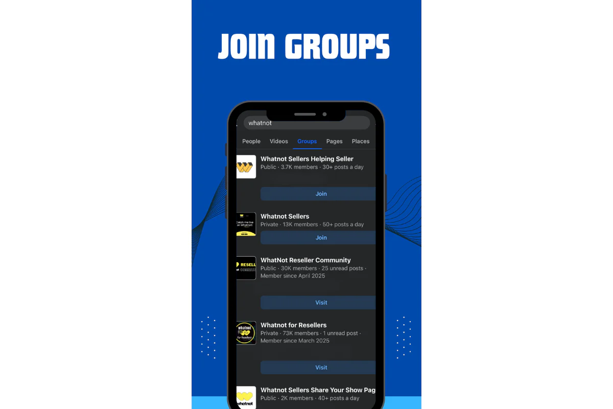 - Join Facebook Groups: Search for groups that cater to Whatnot resellers or the specific niche you’re targeting. By actively joining discussions, you can gain followers that are interested in your product selection. This can also help you get an idea of how sellers interact with others.